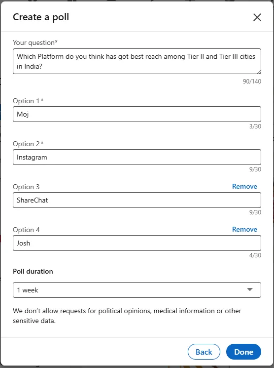 Opinion-based or trend-based questions get higher participation vs sales or promotional polls.