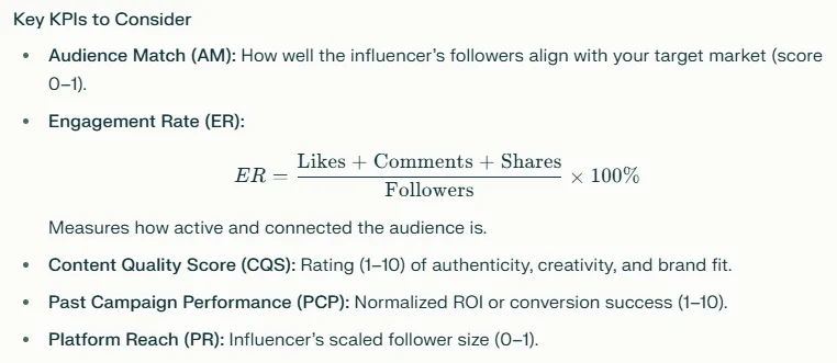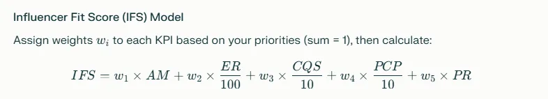 Picking the right influencer is like matchmaking for brands—there’s a strategic model behind it that helps maximize ROI and campaign impact. Here’s an actionable approach with KPIs and a simple mathematical model for brand managers: