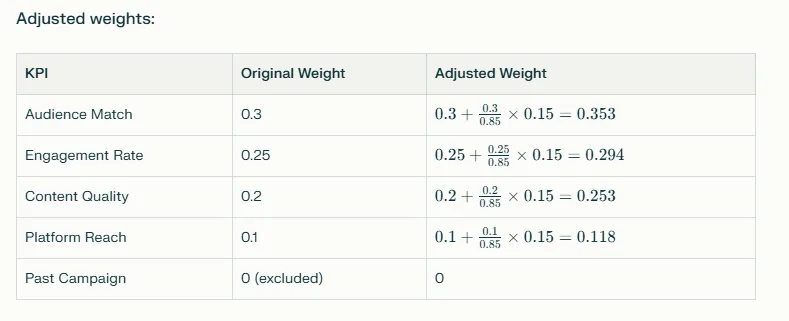 Arriving at the weights for KPIs like Audience Match (AM), Engagement Rate (ER), Content Quality Score (CQS), Past Campaign Performance (PCP), and Platform Reach (PR) depends on your brand’s specific campaign goals, priorities, and historical data.